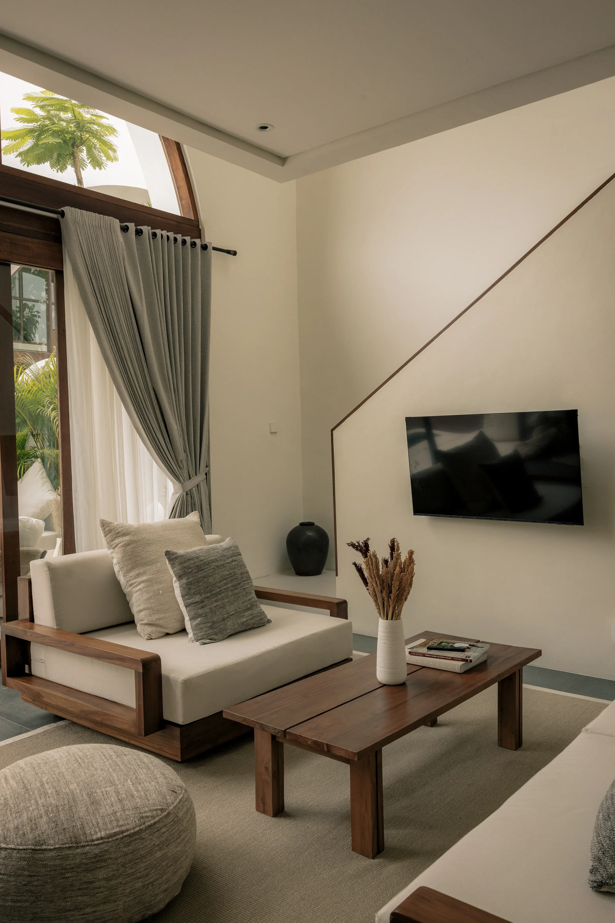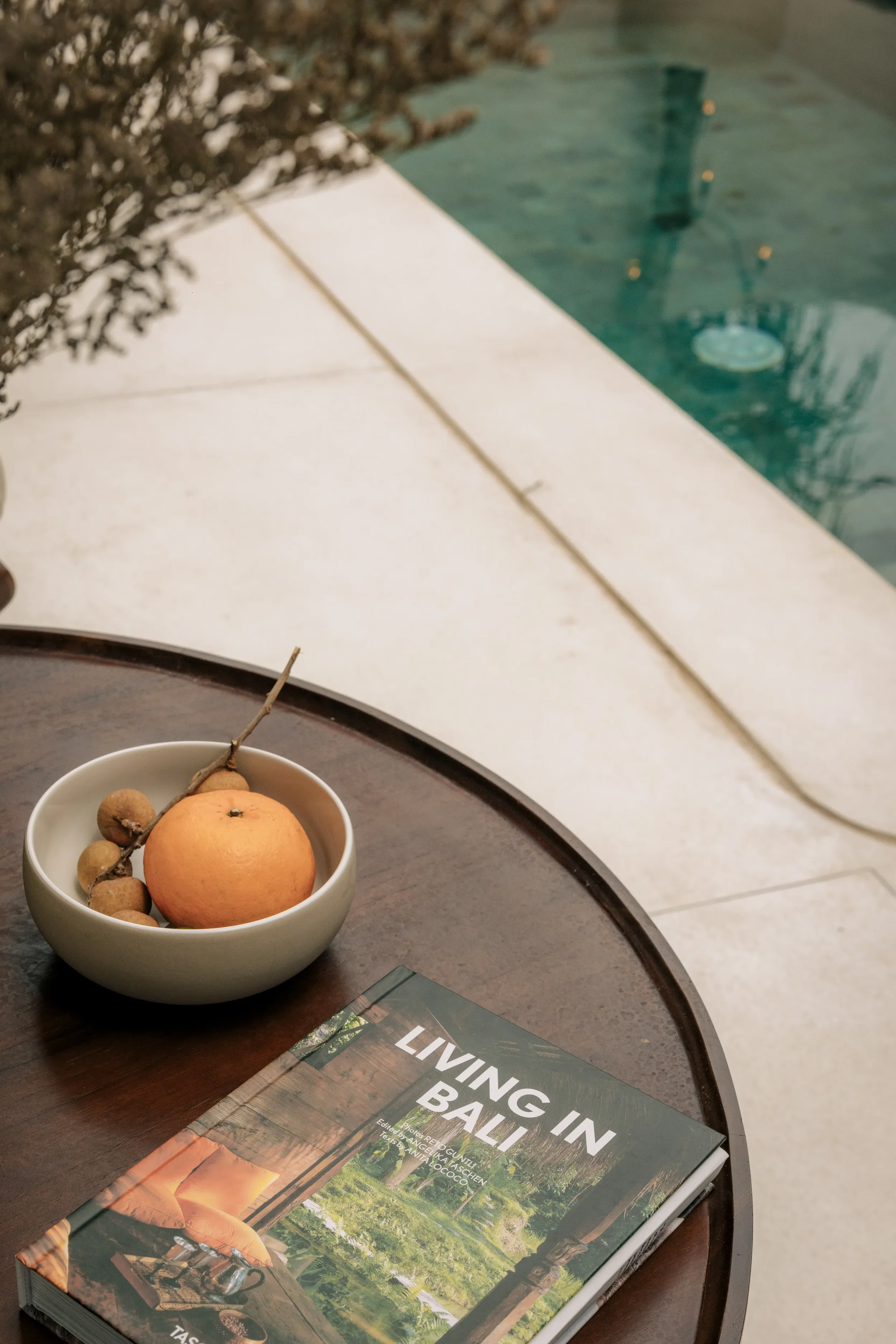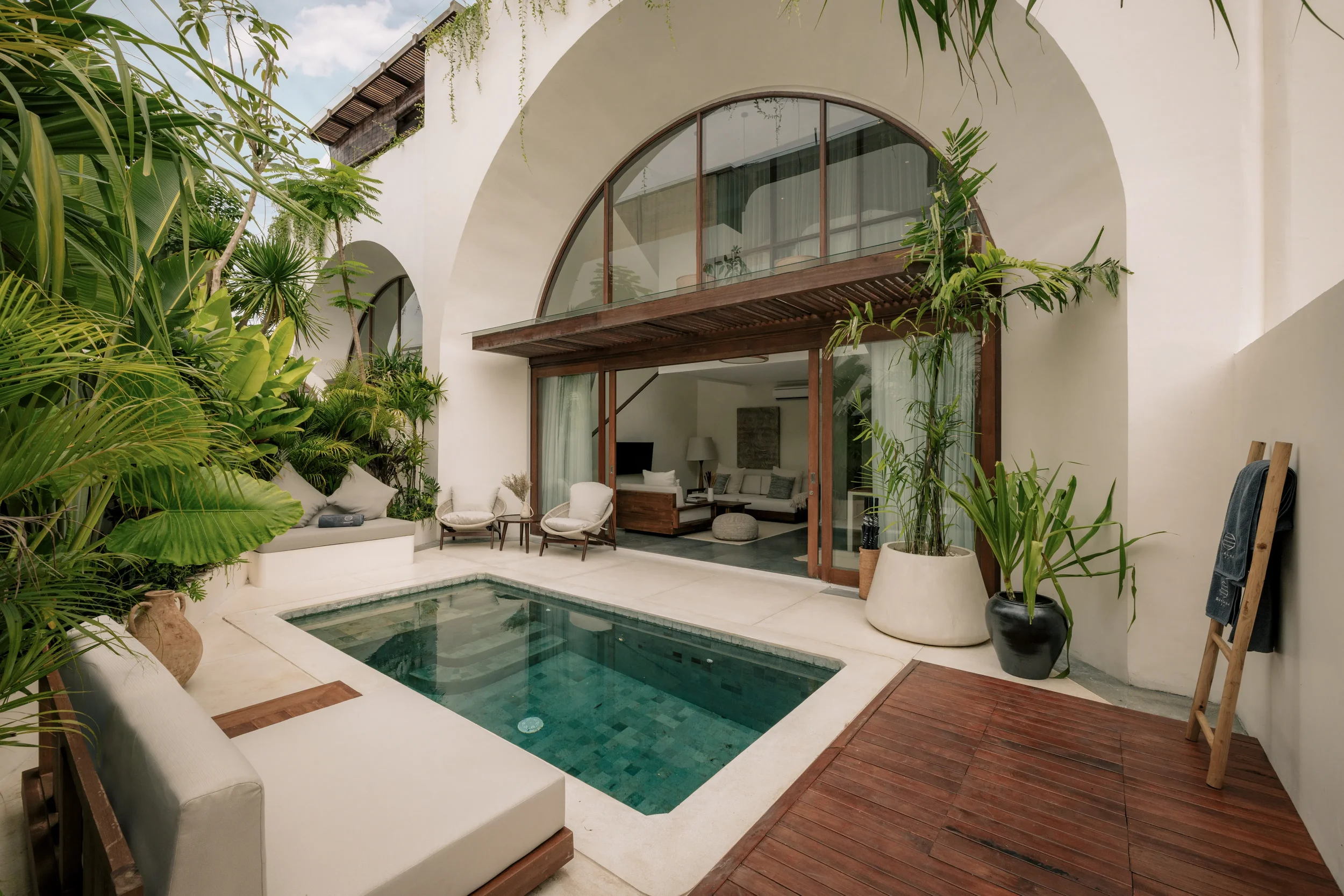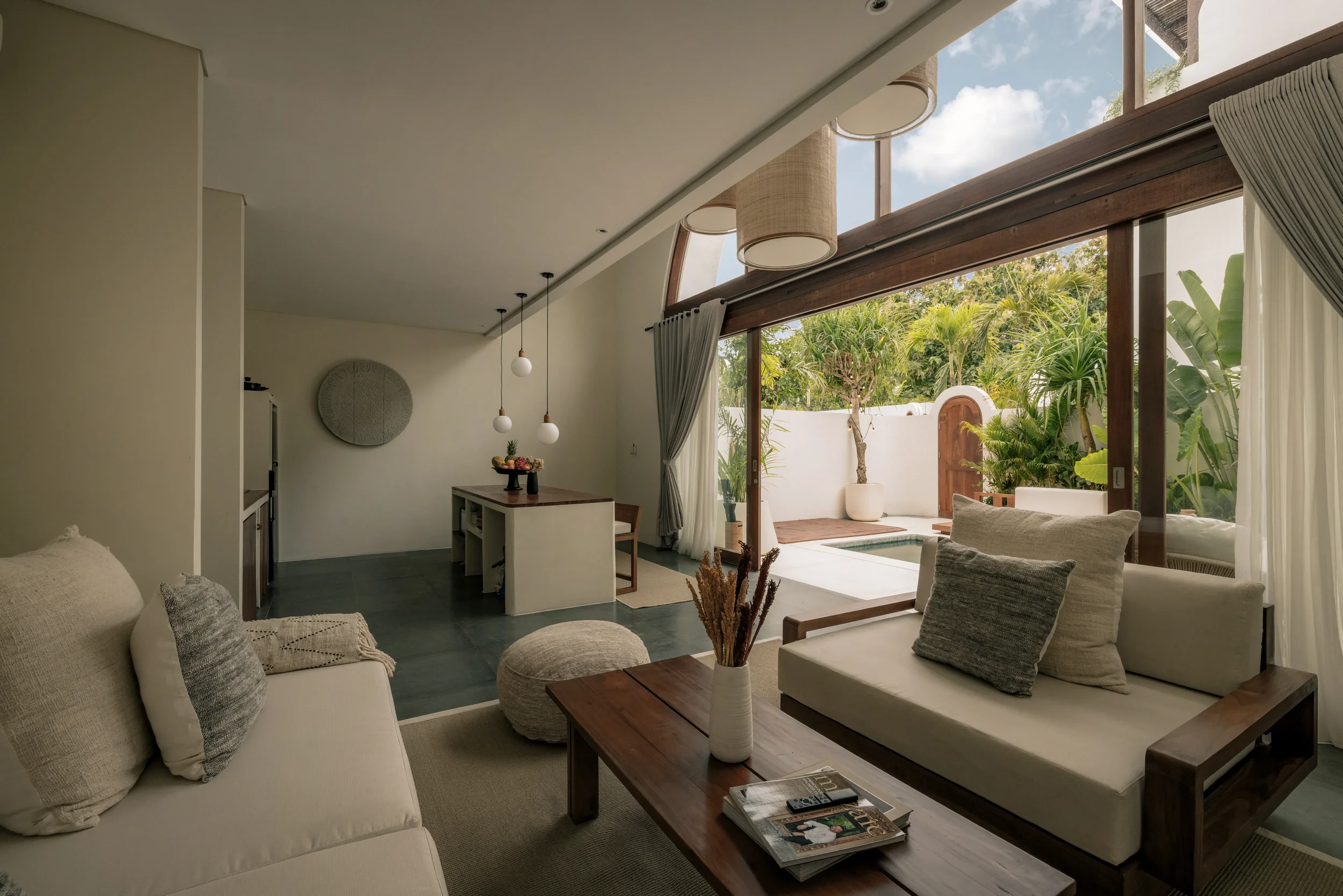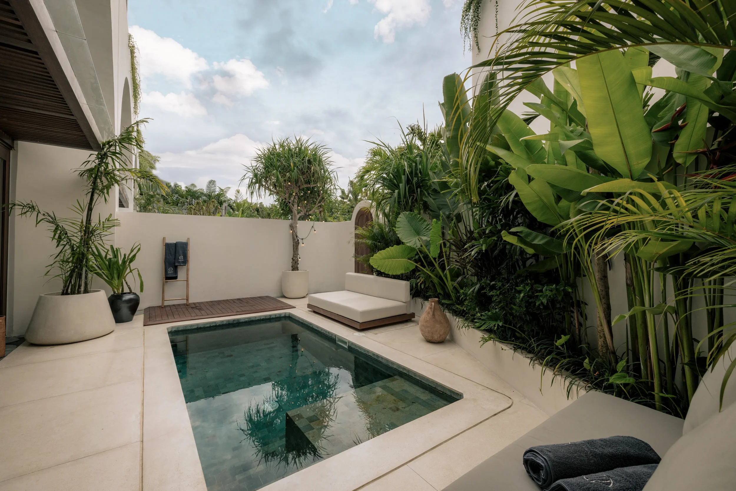 A three-bedroom penthouse villa with panoramic views and a private pool framed by verdant greenery. The terrace opens to the sky and the distant ridges of Bali’s volcanoes. The layout offers space to gather and room to rest.
