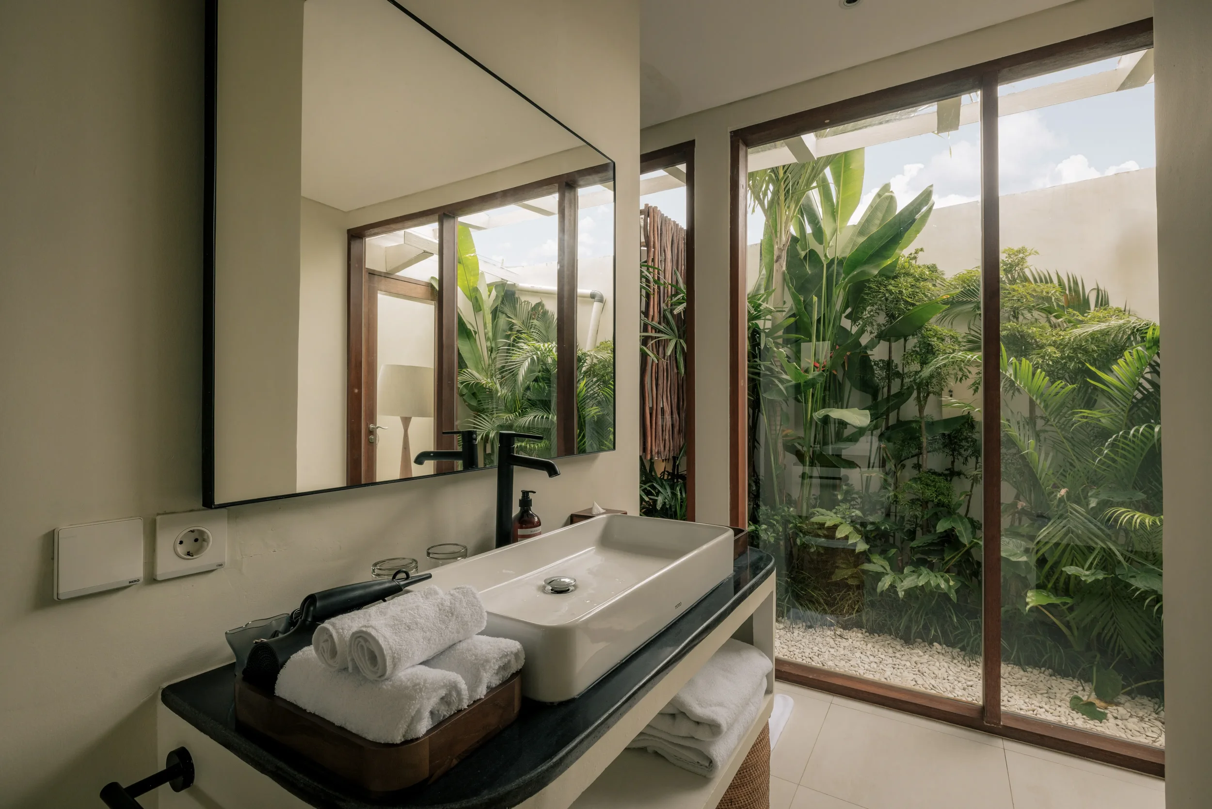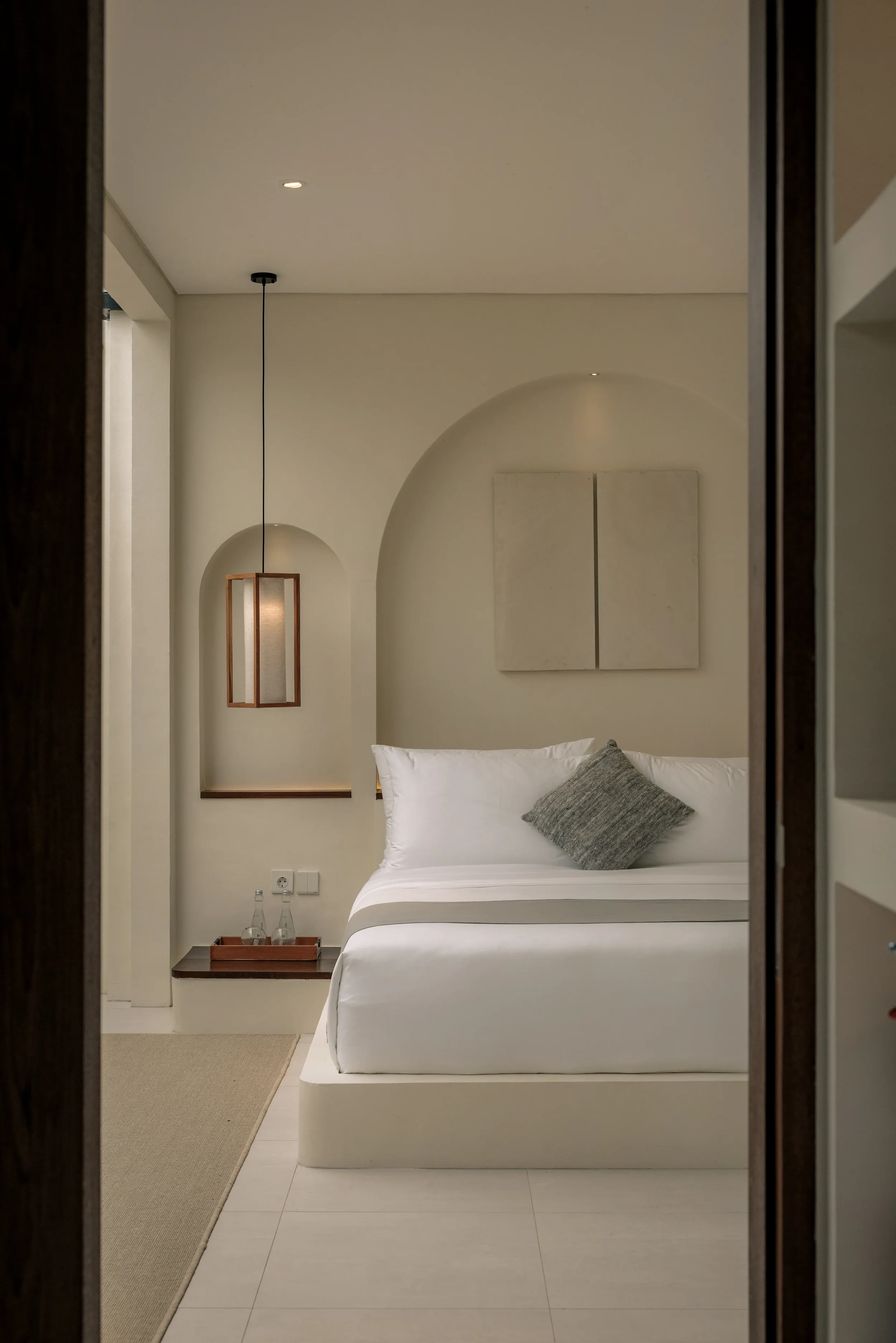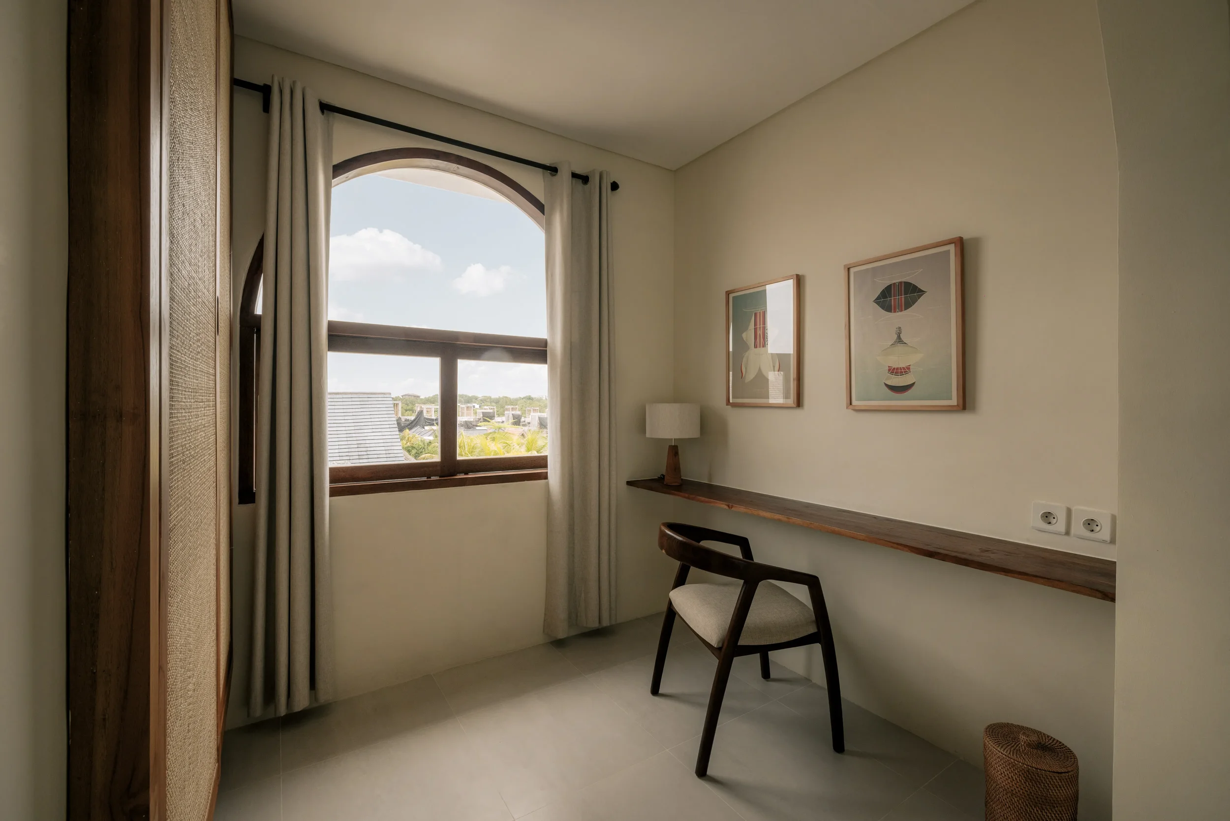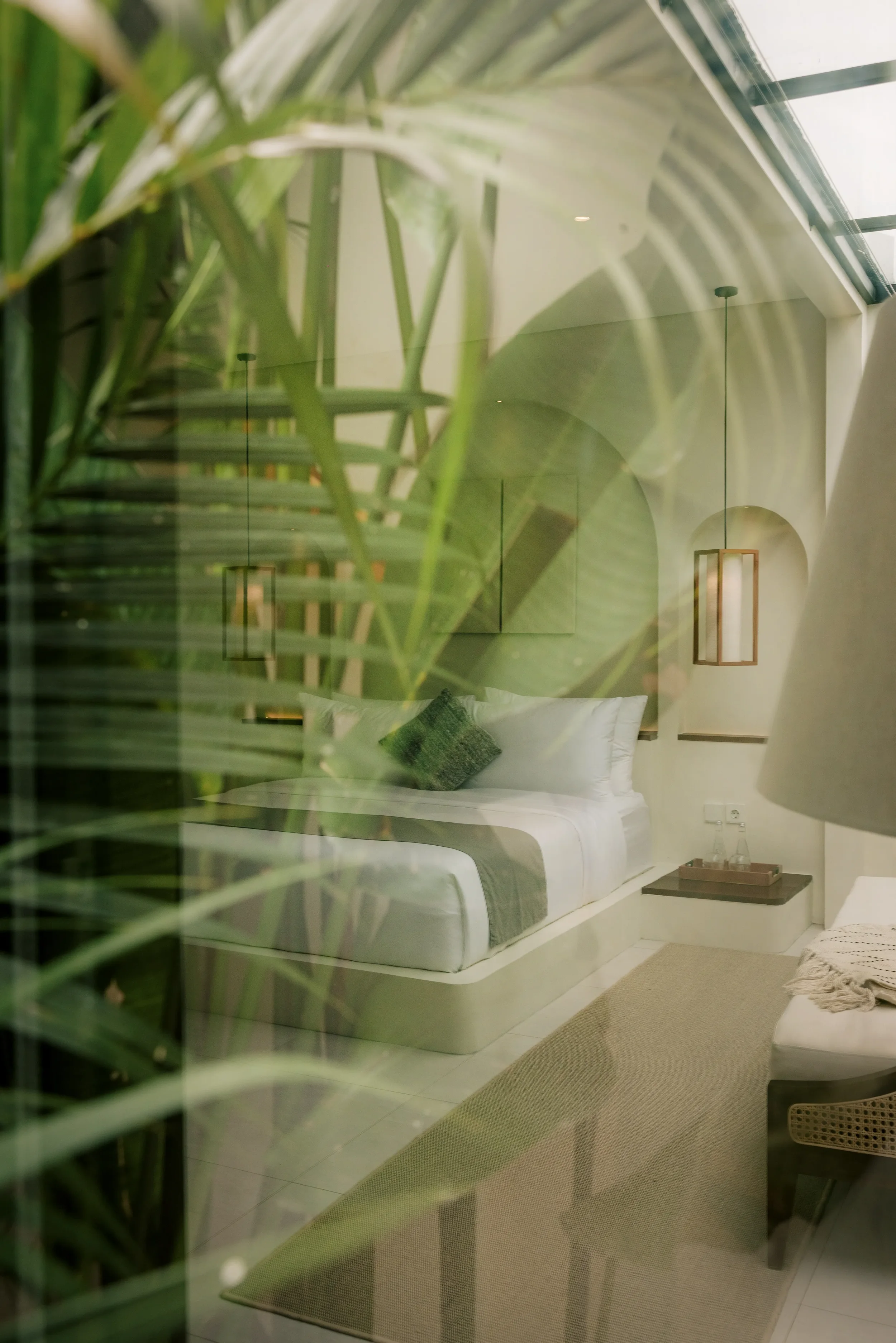 A three-bedroom penthouse villa with panoramic views and a private pool framed by verdant greenery. The terrace opens to the sky and the distant ridges of Bali’s volcanoes. The layout offers space to gather and room to rest.